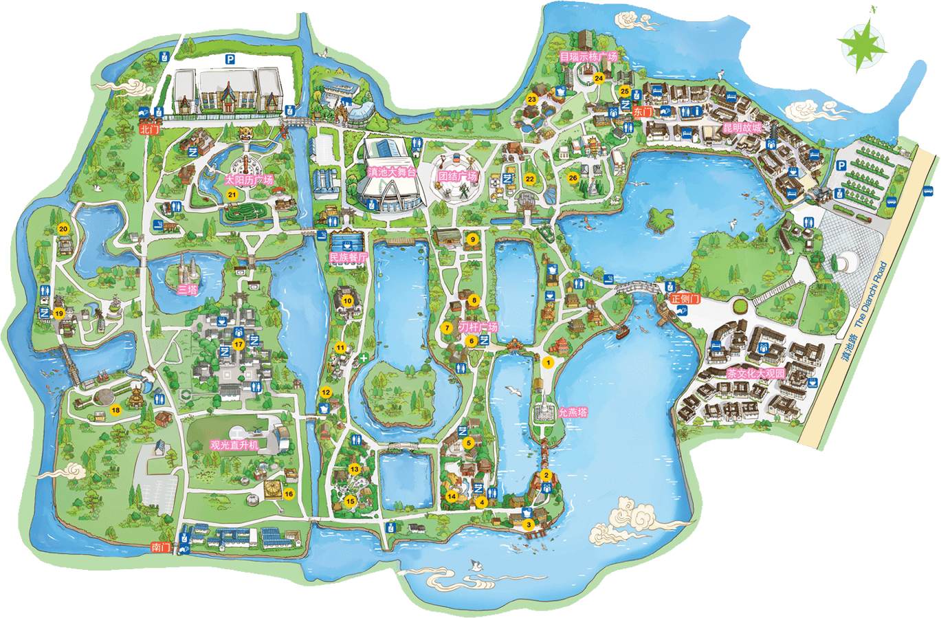 傣族人口約107萬(wàn)人,主要分布在云南的德宏傣族景頗族自治州、西雙版納傣族自治州及瀾滄江流域的河谷壩子區(qū)域。傣族寨是進(jìn)入民族村的第一個(gè)村寨,占地面積27畝,三面環(huán)水,綠樹掩映。一幢幢“干欄式”傣家竹樓,通過蜿延的紅砂石小徑聯(lián)向肅穆的緬寺。巍峨壯觀的白塔,精巧玲瓏的風(fēng)雨橋,以及風(fēng)雨亭、水井、鐘亭等建筑充滿著傣家的濃郁風(fēng)情,是傣寨真實(shí)的民間景觀再現(xiàn)。一年一度的“潑水節(jié)”期間,這里都有活潑歡快的“象腳鼓舞...